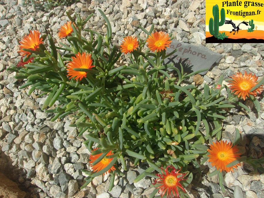 feuilles cireuses. Les fleurs sont rouges, oranges et jaunes. Le Malephora est une plante grasse rampantes et faiblement arborescente. Apres la chute des pétales, une capsule fermée par une membrane, contenant les graines est bien visible et apparente. Cette capsule s'ouvrira avec la pluie et liberera les graines du Malephora. Bon à savoir: Les Malephora sont les premiers à fleurir et les derniers à s'arreter |