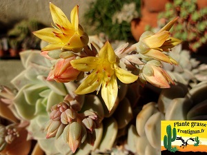 référence: xGraptoveria 'Helios' Synonyme(s) + référence(s): Origine: Graptopetalum paragayense x Echeveria Sp (ou l'inverse) Famille: Crassulaceae Description: Graptoveria 'Helios' est une succulente rustique, adaptée à la culture en exterieur. Sa résistance au froid et à la chaleur lui permet d'etre utilisée en rocaille ou en pot. Feuille: verdatre, couverte de pruine bleu clair, plate dessus et convexe dessous, se terminant par une petite pointe. La rosette atteint 8 - 10 cm de diametre. Tige: rigide, d'abord érigée puis rampante / retombante. Elle porte des ramifications. Fleurs / hampe: jaunes(interieur) et jaunes portant des traces rougeatres à l'exterieur Croissance: assez rapide au printemps, été, automne Racines: fines, courtes et assez nombreuses. Graptoveria 'Helios' peut etre cultivé en pot ou en rocaille mediterraneenne Exposition: plein soleil, mi-soleil Résistance au froid: -6°C sans protection; peut être un peu plus bas. Résistance à la chaleur: tres bonne Arrosage: modéré (1 x 10 jours en été) pour les plantes en pot; inutile en pleine terre. Méthode de reproduction: bouturage de feuille, de ramification Parasite(s) possible(s): non observé Substrat: 3/4 terreau + 1/4 terre végétale + engrais organique; terre sans argile pour les rocailles Attention au risque de confusion avec Graptoveria 'Titubans' |
